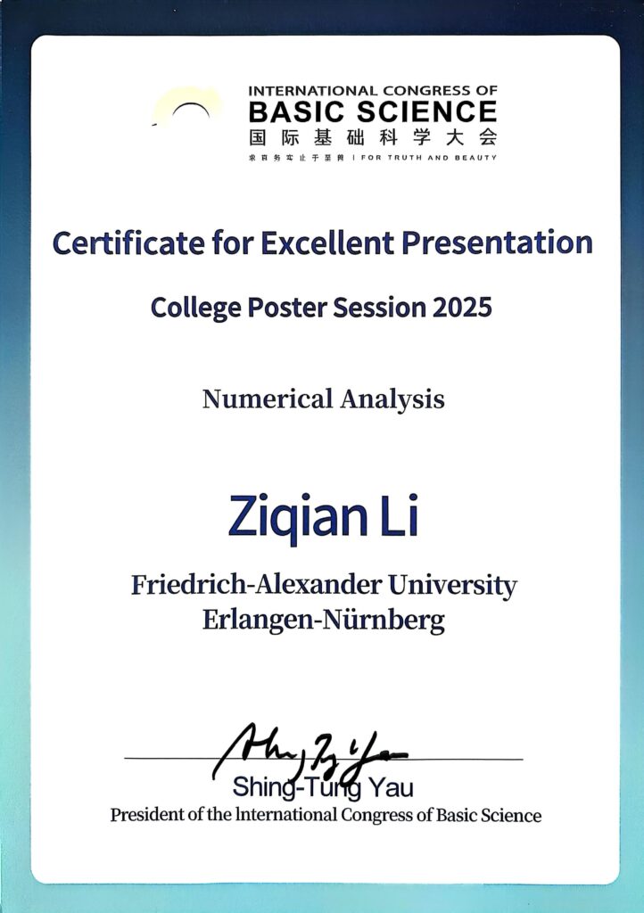 Hi! My name is Ziqian Li, and I am a doctoral student at FAU DCN-AvH, the Chair for Dynamics, Control, Machine Learning and Numerics – Alexander von Humboldt Professorship under the supervision of Prof. Enrique Zuazua at Friedrich-Alexander-Universität Erlangen-Nürnberg, Bavaria (Germany).